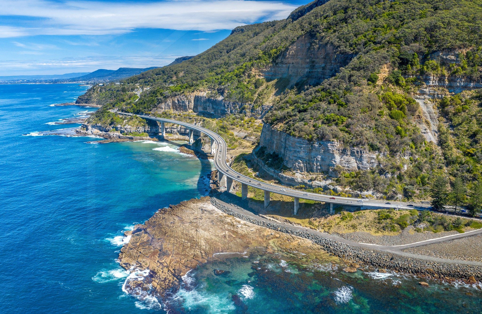 Next, we’ll head south and cross the spectacular Sea Cliff Bridge, one of Australia’s most iconic engineering feats. The bridge hugs the rugged cliffs of the coastline, curving gracefully over the ocean below. This is a once-in-a-lifetime experience for any rider, as the open-air journey lets you fully appreciate the awe-inspiring scenery that surrounds you. The rumble of the engine combined with the sight of waves crashing against the cliffs creates an unforgettable coastal ride.